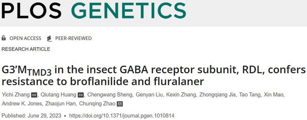 6月29日,ios版雷竞技官网植物保护学院昆虫生理生化与分子生物学团队在国际生物学知名期刊PLoS Genetics 在线发表了题为“G3’MTMD3in the insect GABA receptor subunit, RDL, confers resistance to broflanilide and fluralaner”的研究论文。该研究利用计算生物学、电生理和CRISPR/Cas9基因编辑技术,揭示和验证了异噁唑啉类杀虫剂氟雷拉纳和间二酰胺类杀虫剂溴虫氟苯双酰胺在昆虫离子型GABA受体中的具体作用靶点,为解析其耐药性形成机制提供了新见解。