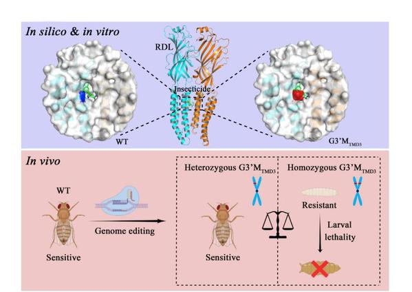 离子型GABA受体是昆虫神经系统中最主要的抑制性神经递质受体,也是重要的杀虫剂靶标。两类传统的GABA门控氯离子通道阻断剂——环戊二烯有机氯类杀虫剂(狄氏剂、硫丹等)和苯基吡唑类杀虫剂(氟虫腈、乙虫腈等),以及两类新型的GABA门控氯离子通道变构调节剂——异噁唑啉类杀虫剂(氟雷拉纳、异噁唑虫酰胺等)和间二酰胺类杀虫剂(溴虫氟苯双酰胺、环丙氟虫胺等),均通过作用于RDL亚基而发挥杀虫活性。前期体外及体内研究揭示了RDL亚基第二跨膜区(TMD2)的丙氨酸(A2’TMD2)突变是昆虫对狄氏剂(A2’STMD2)或氟虫腈(A2’NTMD2)产生靶标抗性的关键原因,但该位点突变并不影响重组RDL受体对异噁唑啉类或间二酰胺类杀虫剂的敏感性。后续体外研究结果表明,RDL亚基第三跨膜区第三位甘氨酸(G3’TMD3)可能是上述两类新型杀虫剂重要的作用靶点。然而,长期以来体内实验数据的缺乏,阻碍了对该药靶模型的充分验证。