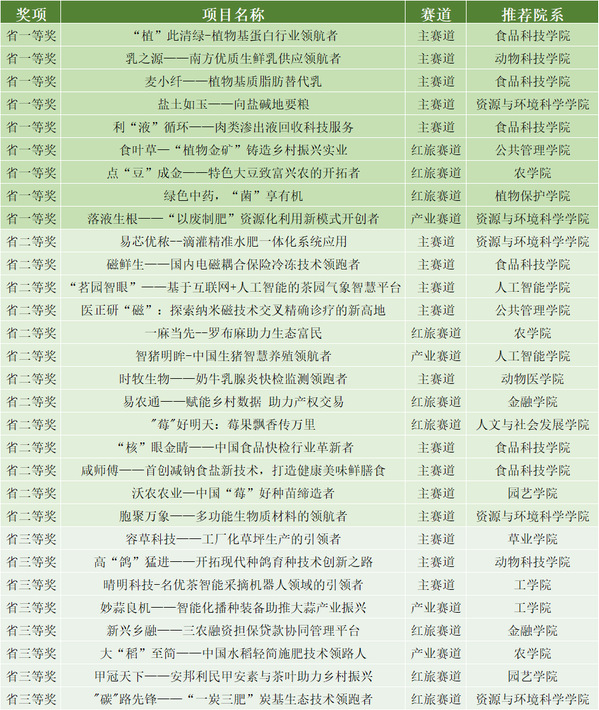 7月16日—7月20日,“建行杯”第九届中国国际“互联网+”大学生创新创业大赛江苏省选拔赛在南京林业大学举行。我校共获一等奖9项,二等奖13项,三等奖8项,获奖总数再创新高,位居全省前列。食品科技学院本科生初创组项目“植此清绿—植物基蛋白行业领航者”进入四强争夺赛。我校也获评江苏省高教主赛道和青年红色筑梦之旅赛道2项“优秀组织奖”。