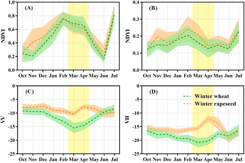 图3. 冬小麦和冬油菜不同遥感特征的时序变化曲线。(A)和(B)分别为基于光学卫星Sentinel-2归一化植被指数(NDVI)和归一化黄度指数(NDYI)的时序变化曲线,(C)和(D)分别为基于SAR卫星Sentinel-1 VV和VH极化的时序变化曲线。(图中虚线为平均值,对应阴影区域为标准差,黄色背景为油菜开花期时间范围)