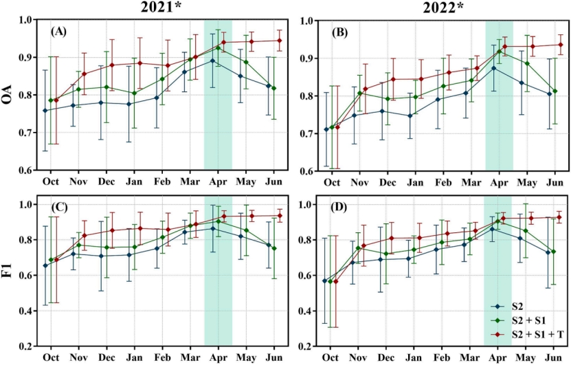 图6. 基于不同分类特征和模型迁移的冬小麦分类精度变化趋势。(A)和(C)分别为2021年冬小麦总体分类精度和F1得分,(B)和(D)分别为2022年对应结果(图例中S2、S1和T分别代表Sentinel-2、Sentinel-1和时相特征)
