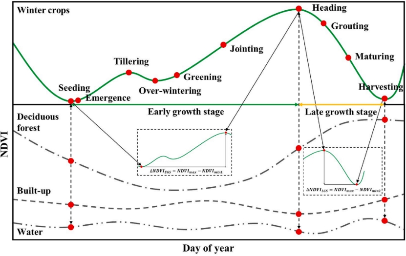 图1. 冬季作物指数构建示意图。(图中用冬小麦代表冬季作物物候期)