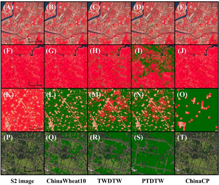 图5.ChinaWheat10(第二列)和其他冬小麦分类产品(第三、四、五列)的分类细节对比。第一、二、三、四行分别代表建筑、林地、冬小麦、冬小麦和冬油菜混合区域,各产品中的绿色部分为识别出的冬小麦像素