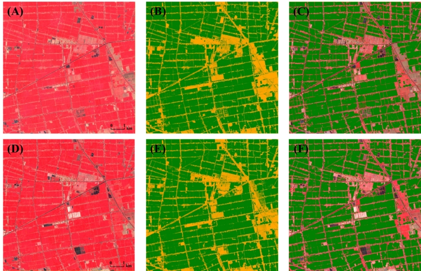 图2. 基于冬季作物指数和自适应阈值分割的冬季作物像素提取。(A)、(B)和(C)分别为2020年冬小麦生长旺盛期的Sentinel-2标准假彩色合成影像、冬季作物指数以及提取的冬季作物像素,(D)、(E)和(F)分别为2021年相应内容