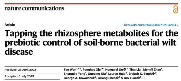 近日,Nature Communications在线发表了沈其荣院士团队的研究成果:Tapping the rhizosphere metabolites for the prebiotic control of soil-borne bacterial wilt disease。该研究通过解析番茄发病和健康植株的根际代谢组,挖掘潜在的益生元,并结合多组学手段明确了益生元驱动根际微生物维持植物健康的微生态机制。研究成果标志着我国土传病害防控进入益生元精准调控阶段。