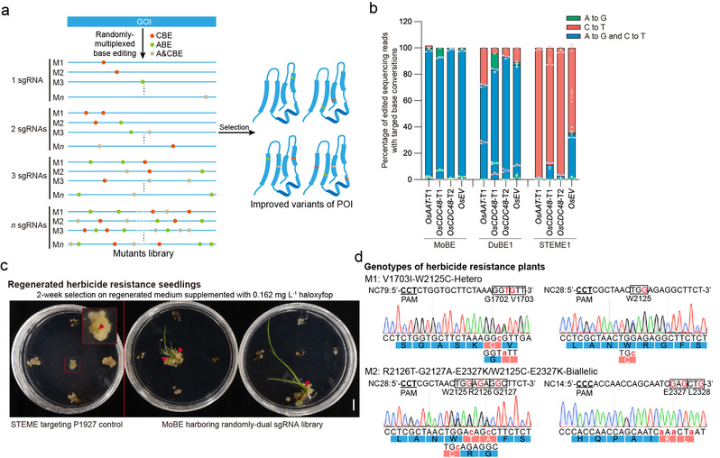 基因的定向进化通过模仿自然选择的过程,以将基因产生的蛋白功能导向自定义的目标,其过程包括突变的产生、筛选和扩增。相较于体外定向进化技术,基于CRISPR的原位定向进化技术更适用于定向进化多数作物关键基因,以达到作物改良的目的。如何创制变异类型更加丰富的饱和突变体文库是原位定向进化技术的关键。近日,万建民院士团队开发了新型的多重正交碱基编辑器MoBE和随机化多sgRNA组装技术,极大地提升了原位定向进化所需的潜在突变丰度,并获得了新的抗除草剂水稻突变植株。
