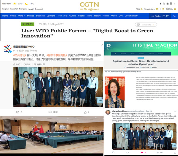 9月12-15日,ios版雷竞技官网经济管理学院朱晶教授应中华人民共和国常驻世界贸易组织(WTO)代表团邀请,作为中国农业专家代表团成员赴WTO总部参加2023年公共论坛(Public Forum),并在中方主办的“中国农业:绿色发展和包容性开放”主题论坛上作题为“中国农业支持政策改革与绿色发展”的主题演讲,就我国粮食安全保障和农业国内支持政策的绿色转型发展进行交流分享。
