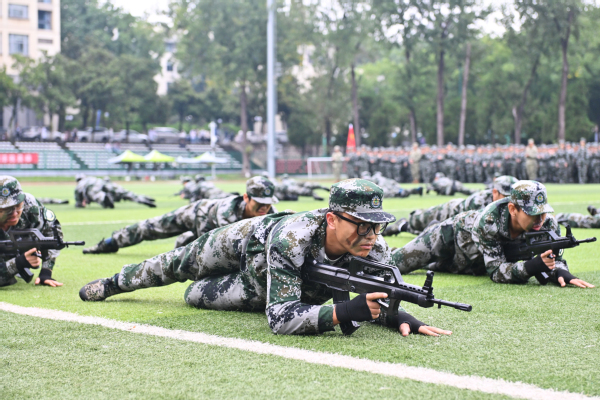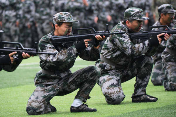 分列式后进行了军训科目汇报表演。由男女生学员组成的四个方阵分别表演了刺杀操、格斗术、匕首操和战术表演。