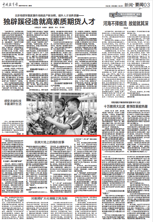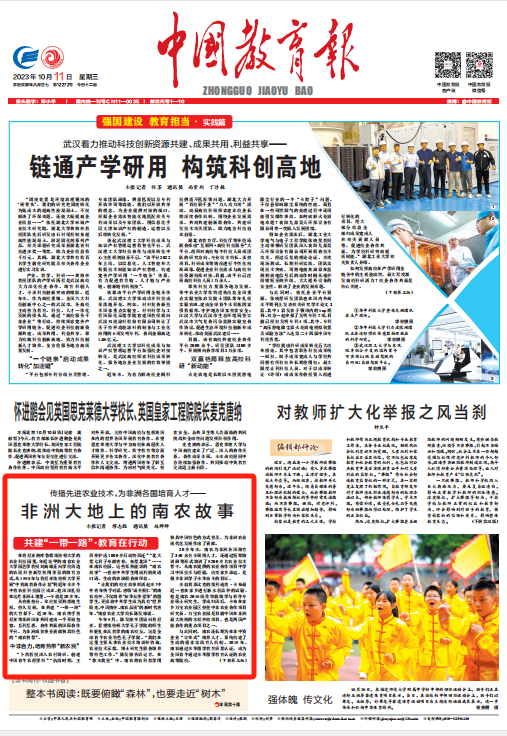 10月11日,《中国教育报》头版倒头条“共建一带一路·教育在行动”专栏刊发题为《非洲大地上的南农故事》的深度通讯,报道“一带一路”上我校国际合作与国际教育的“南农方案”。