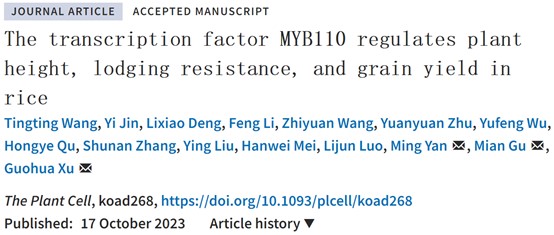近日,资环学院徐国华教授团队和上海市农业生物基因中心罗利军研究员团队在The Plant Cell合作发表了题为 “The transcription factor MYB110 regulates plant height, lodging resistance, and grain yield in rice“ 的研究论文。