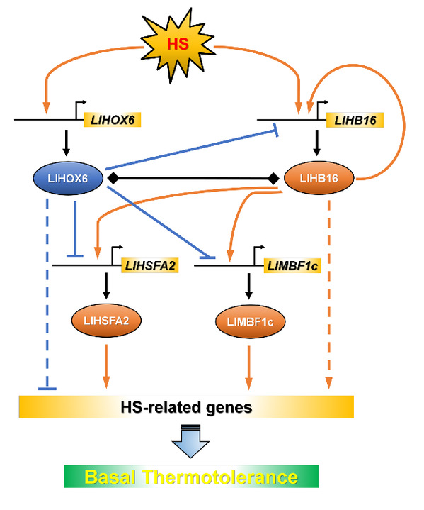ios版雷竞技官网滕年军教授团队近年来在百合耐热性调控机制研究中取得了一系列研究进展,揭示了百合热激转录因子HSFA3通过高温诱导的可变剪接机制精细调控耐热性的机制(Wu et al., 2019, Plant Physiology; 与中国农业大学义鸣放教授合作完成);阐明了百合WRKY39以钙离子依赖的方式与CaM3互作精细调控桥接因子MBF1c的表达正向调控耐热性机制(Ding et al., 2021, Horticulture Research);发现了百合WRKY转录因子WRKY22直接作用于DREB2的上游参与耐热性的调控(Wu et al., 2022, Horticulture Research);在百合中鉴定了MYB305-C3H18-WRKY33功能模块调控耐热性(Wu et al., 2023, Molecular Horticulture);鉴定了一个膜结合的NAC转录因子LlNAC014,其响应高温转移至核内,激活DREB2-HSFA3模块正向调控耐热性(Wu et al., 2023, Journal of Experimental Botany);该篇论文进一步发现百合另一个HD-Zip I成员HOX6与HB16互作,拮抗地调控百合耐热性。基于上述系统的研究,该团队构建了比较完善的百合响应高温胁迫的分子调控网络,将为百合乃至其他农作物耐热性改良提供了重要理论基础。