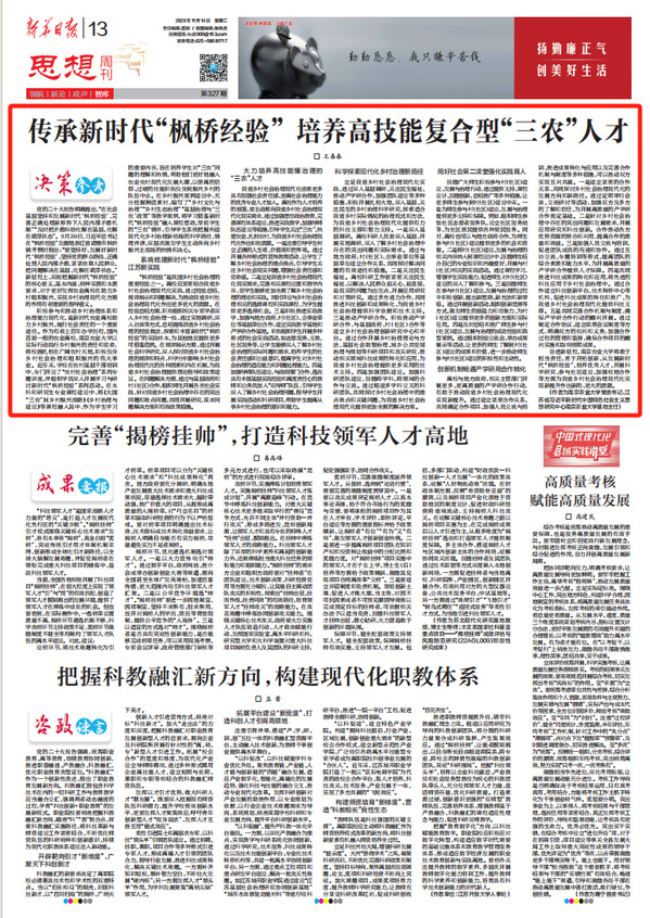 编者按:11月14日,《新华日报》思想周刊“智库”头条刊发我校党委书记王春春署名文章《传承新时代“枫桥经验” 培养高技能复合型“三农”人才》。文章深刻把握新时代“枫桥经验”的核心要义、基本内涵、精神实质和本质要求,从发展新时代“枫桥经验”、培养优秀人才、开展科学研究、参与社区建设、加强校地合作等方面入手,全面展现了我校围绕提升全省乡村社会治理现代化水平,助力乡村振兴所开展的特色工作和亮点成效。
