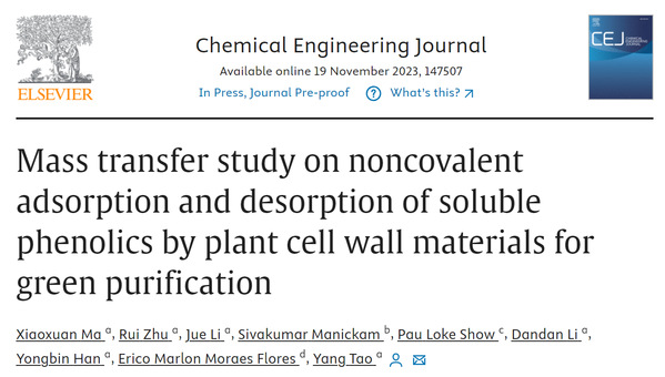 11月,食品学院韩永斌教授课题组在国际期刊Chemical Engineering Journal发表题为“Mass transfer study on noncovalent adsorption and desorption of soluble phenolics by plant cell wall materials for green purification”的研究性论文。本文第一作者为ios版雷竞技官网食品科技学院硕士麻筱璇,陶阳副教授为通讯作者,韩永斌教授、李丹丹副教授参与了项目部分工作。文章揭示了植物细胞壁材料非共价吸附/解离可溶性多酚的物理传质新机制,开发了可溶性多酚绿色纯化新技术。