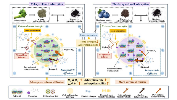 基于植物细胞壁与可溶性多酚间的非共价互作关系,本团队提出通过调控植物细胞壁与可溶性多酚间的互作行为,从而实现植物多酚的绿色分离。本研究首先对比了多种果蔬细胞壁组分吸附多酚的能力,发现芹菜和蓝莓细胞壁组分具有较强的吸附能力;进一步探究了不同环境离子强度下芹菜和蓝莓细胞壁组分与多酚互作的理化特性,并基于多孔扩散理论数值仿真了芹菜和蓝莓细胞壁吸附/解离多酚的物理过程;最后系统比较了植物细胞壁吸附/解离与传统大孔树脂吸附/解离技术在分离多酚方面的优劣。