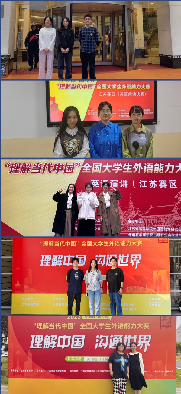 11月,“外研社·国才杯”“理解当代中国”全国大学生外语能力大赛(英语组)系列比赛江苏赛区决赛结果揭晓。此次比赛分设演讲、写作、阅读、笔译、口译五大赛项,写作大赛中,冯明萱获得一等奖、年雨彤获二等奖;阅读大赛中,耿琪茹、孙一涵分获二等奖,王颖获得三等奖;演讲大赛中,张雅萱获得二等奖、杨紫嘉和宗易分获三等奖;笔译大赛中,刘浩然获得一等奖,禚悦获得二等奖,李祎波获得三等奖;口译大赛中,倪子玥和沈其羽分获三等奖。其中冯明萱、刘浩然入围全国总决赛。
