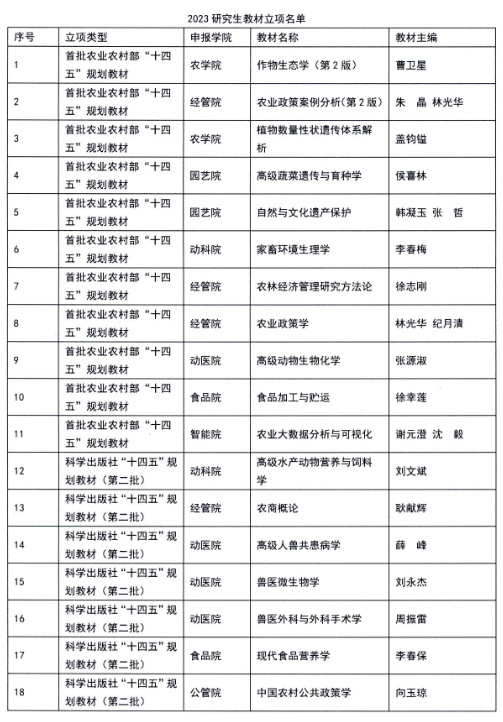近日,农业农村部、科学出版社陆续公布了“十四五”规划教材立项目录,学校18部研究生教材获批立项。其中,《作物生态学(第2版)》等11部教材获批首批农业农村部“十四五”规划教材立项,《高级水产动物营养与饲料学》等7部教材获批科学出版社“十四五”普通高等教育规划教材(第二批)立项。