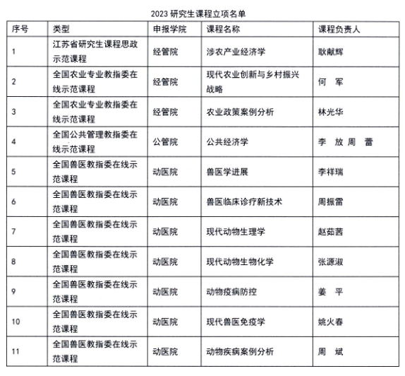 2023年,学校研究生优质教学建设成果丰硕。在课程建设方面,1门课程获评江苏省研究生课程思政示范课程,10门分别获批全国农业专业教指委、全国公共管理专业教指委、全国兽医专业教指委在线示范课程立项。在案例建设方面,1项成果入选教育部学位中心案例研究典型成果,3项案例获批教育部学位中心主题案例立项,9项案例入选全国各专业学位教指委案例库。