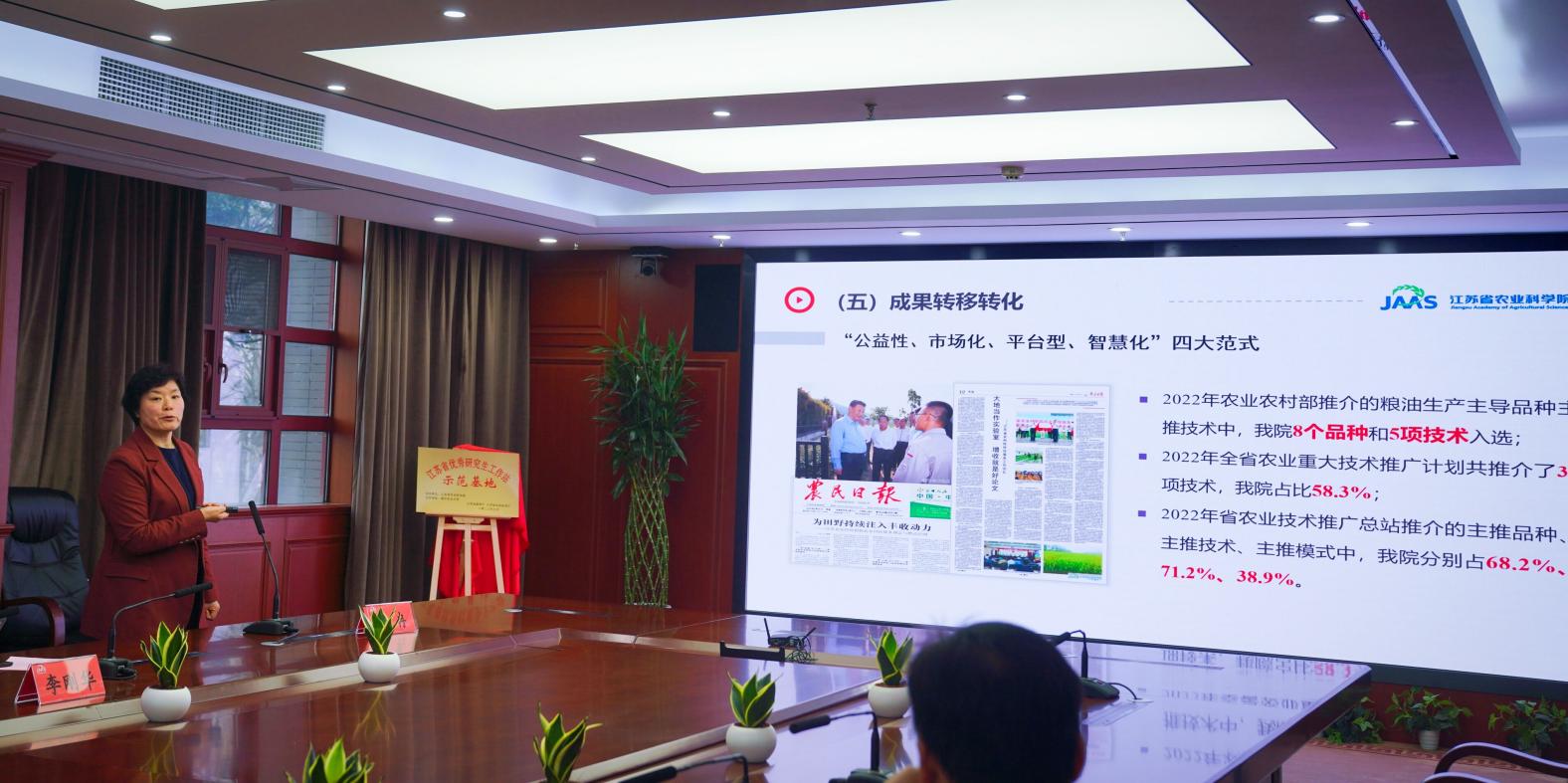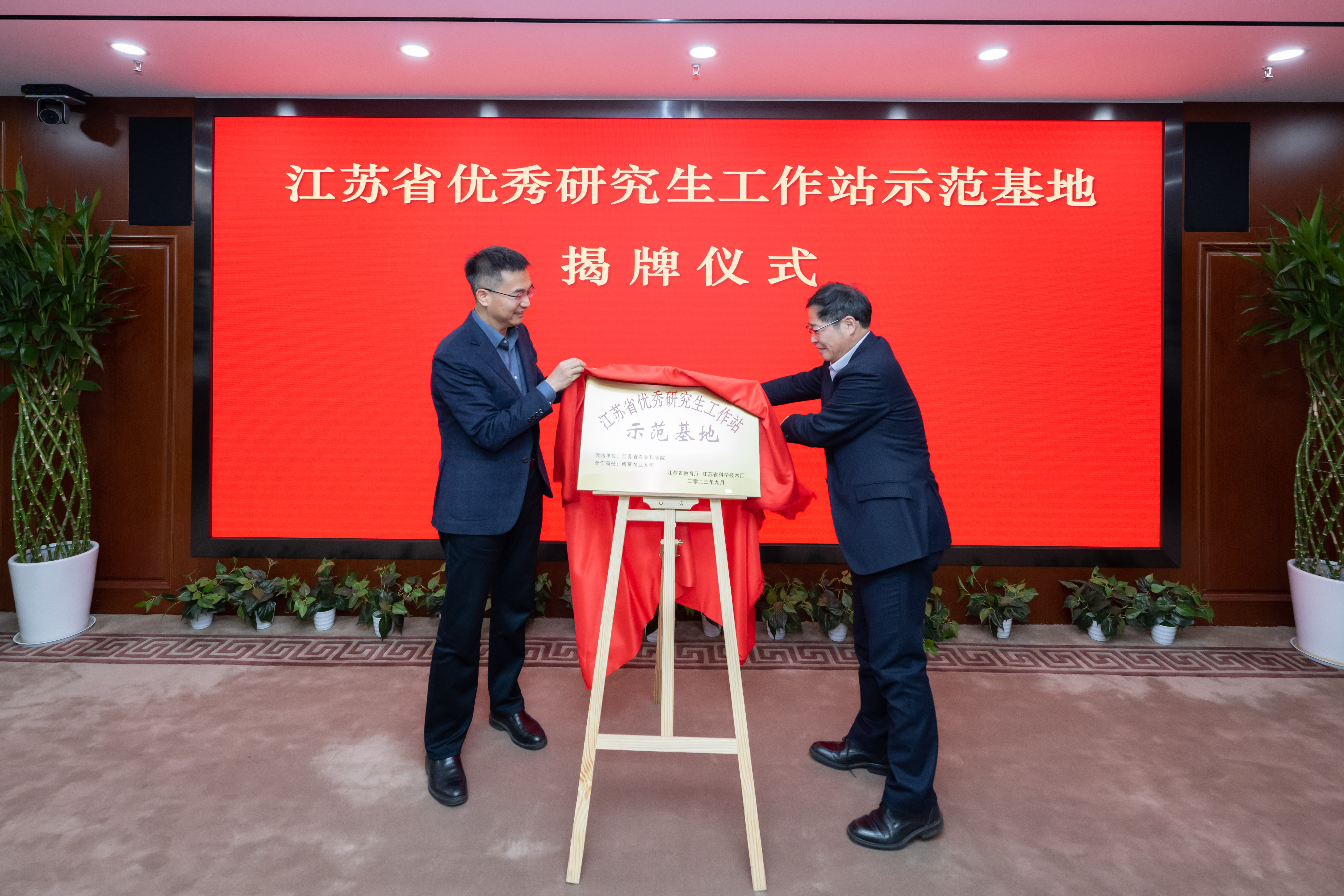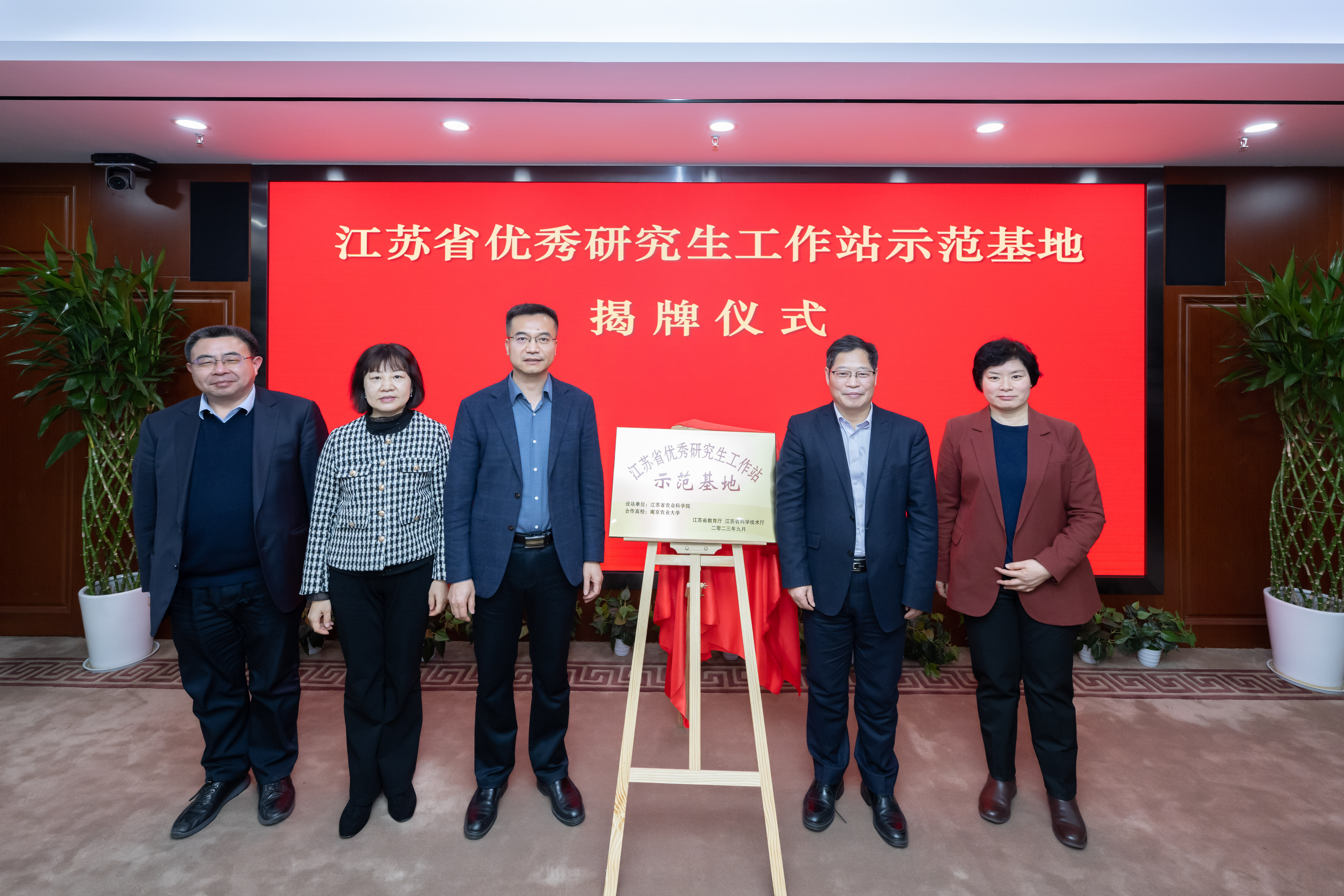 会上,刘江涛宣读江苏省优秀研究生工作站示范基地批文。陈发棣、易中懿共同为示范基地揭牌。