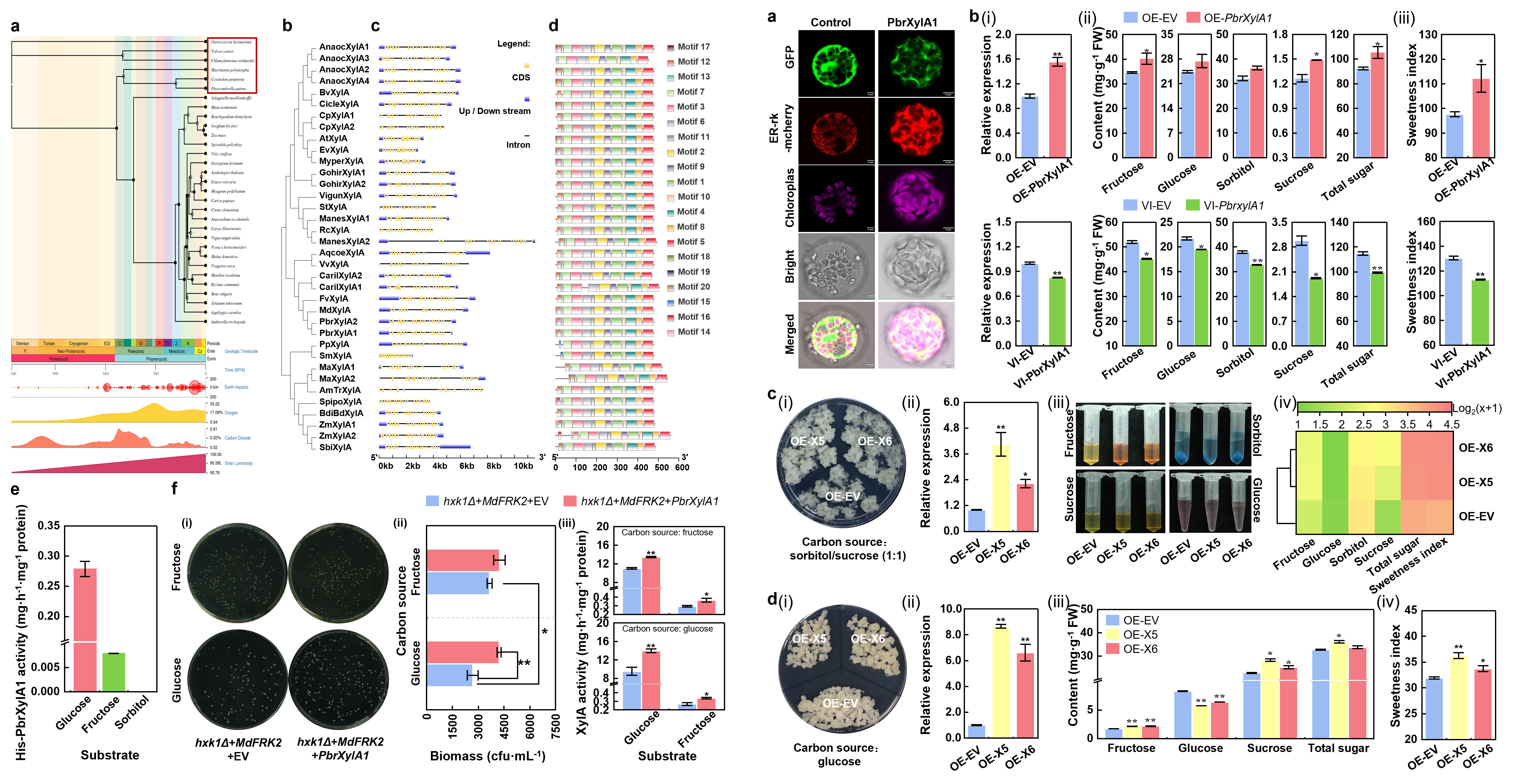 XylA可催化D-葡萄糖异构化为D-果糖,在工业上广泛被用于生产高果糖玉米糖浆。目前所报道的葡萄糖异构酶大多来源于细菌,而在植物中鲜有报道。本研究通过对不同植物和细菌XylA进行进化分析和序列比对发现,植物XylA蛋白起源于1.77亿年前;与细菌XylA相比,植物XylA蛋白的N端存在富亮氨酸信号肽,可能在其内质网定位过程中发挥作用。进一步的体外酶活试验、酵母异源表达以及转化梨果实与愈伤组织等多种手段共同揭示:PbrXylA1可催化葡萄糖异构为果糖,同时促进梨蔗糖与总糖积累以及甜度的提升。
