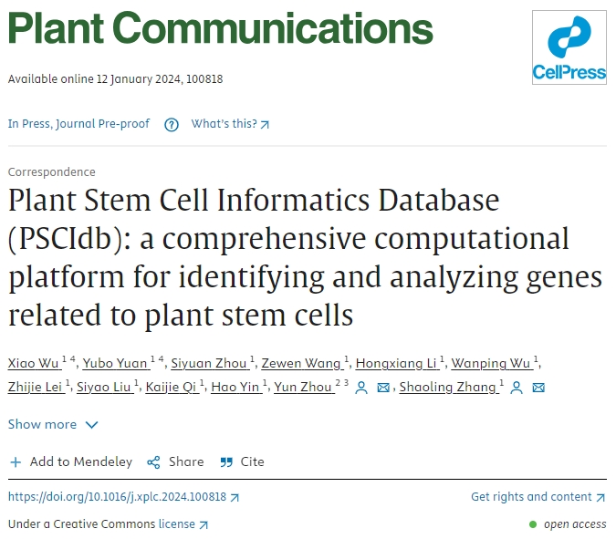 1月12日,ios版雷竞技官网张绍铃院士与普渡大学Yun Zhou教授课题组在Plant Communications发表题为Plant Stem Cell Informatics Database(PSCIdb): a comprehensive computational platform for identifying and analyzing genes related to plant stem cells的论文,构建了植物干细胞信息学分析平台PSCIdb(http://www.plantstemcelldb.org.cn),为跨物种干细胞基因比较、功能和进化研究提供重要宝贵的资源。