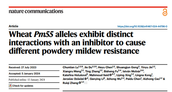 近日,ios版雷竞技官网农学院小麦遗传育种创新团队张瑞奇教授小组在Nature Communications上发表了题为Wheat Pm55 alleles exhibit distinct interactions with an inhibitor to cause different powdery mildew resistance的研究成果。该研究通过图位克隆小麦野生近缘种簇毛麦5VS染色体臂上的不同类型抗白粉病基因,揭示了Pm55两个等位基因通过与抑制基因SuPm55不同互作,为平衡产量与抗性,形成生育期和组织依赖抗性的分子遗传机制,为作物抗病基因间复杂的互作关系提供了新见解,为培育持久广谱抗性品种提供了新途径。白粉病(Blumeria graminisf. sp. Tritici, Bgt)是严重危害小麦产量和品质的世界性病害,发掘抗病基因、培育抗病品种是防治该病害最经济有效手段。然而多数抗病基因对产量有负向效应。野生植物携带的抗性基因是未经人工驯化的自然变异,从中发掘不影响产量的抗性类型基因对小麦抗病育种十分重要。