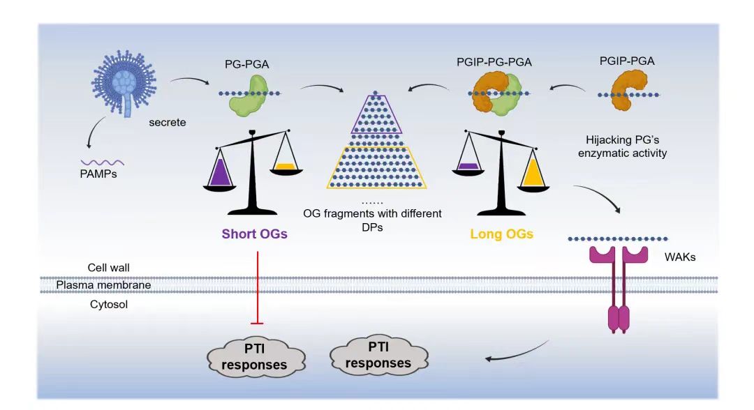 果胶多聚半乳糖醛酸水解酶(Polygalacturonase, PG)是病原菌分泌的一类重要的致病效应子,具有保守的细胞壁降解酶活性,对病原菌的致病性至关重要。自1971年多聚半乳糖醛酸酶抑制蛋白(Polygalacturonase-inhibiting protein, PGIP)从植物细胞壁中被鉴定到作为植物抗病蛋白以来,学界普遍认为PGIP通过抑制PG酶活发挥抗病功能。然而,植物PGIP与病原菌PG互作激活植物免疫的分子机制一直不清楚。
