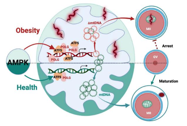 本研究发现肥胖可诱发成熟卵母细胞mtDNA单核苷酸突变增加,且这些突变主要集中在D-loop和编码蛋白质的基因序列上。进一步,该研究也深入解析了该突变发生的作用机制。研究发现,肥胖可抑制AMPKa活性来增加细胞中LonP1含量,继而诱发ATF5蛋白被POLG募集到mtDNA突变的启动子区来大量复制突变的mtDNA(如图1所示)。该研究成果为开发围产期母体营养素或药物来抑制母体肥胖所诱发的mtDNA遗传突变,并进一步改善胎儿和子代的生长代谢健康提供了重要理论和基因靶点。