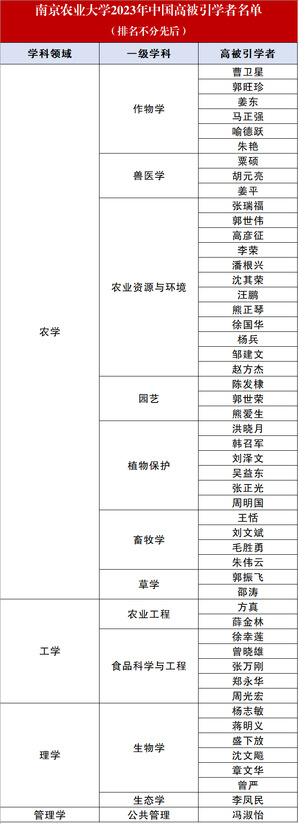 本次上榜共计5801人,来自496所高校、企业及科研机构,覆盖了10个教育部学科领域中的84门一级学科。我校入榜的51名学者,分布在农学(35人)、工学(7人)、理学(8人)、管理学(1人)。