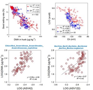 图3. 水稻颖壳DMA含量与结实率、arsM基因丰度与土壤Eh的相关性,与水稻颖壳DMA含量显著相关的土壤细菌(ASV)。TC:郯城;SY:泗阳