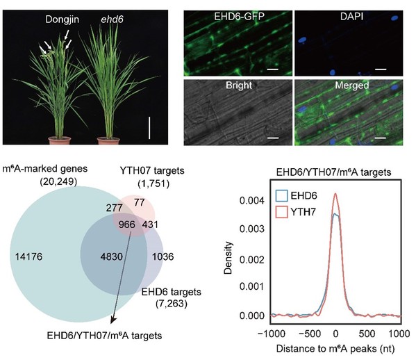 5月9日,万建民院士团队与北京大学贾桂芳团队合作在Molecular Plant发表了题为The RNA binding protein EHD6 recruits the m6A reader YTH07 and sequesters OsCOL4mRNA into phase-separated ribonucleoprotein condensates to promote rice flowering的研究论文。该论文揭示了RNA结合蛋白通过m6A途径介导的相分离过程调控水稻抽穗期的机制。