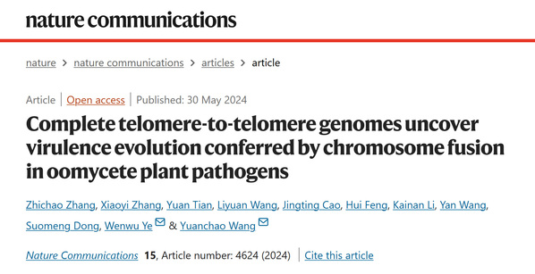 5月30日,我校植物保护学院王源超教授领衔的“大豆病害绿色防控”研究团队,在国际学术期刊《Nature Communications》在线发表了题为“Complete telomere-to-telomere genomes uncover virulence evolution conferred by chromosome fusion in oomycete plant pathogens”的研究论文。该研究首次完成大豆疫霉、终极腐霉等4种卵菌端粒到端粒的无缺失基因组组装,揭示了染色体融合与分裂事件驱动致病基因产生及适应性进化,从而促进病原菌致病力变异的分子机制。