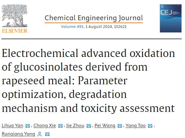 近日,我校食品科技学院杨润强教授课题组在《Chemical Engineering Journal》在线发表了题为“Electrochemical advanced oxidation of glucosinolates derived from rapeseed meal: Parameter optimization, degradation mechanism and toxicity assessment”的研究型论文。该研究跨学科融合食品科学、化学、生物学等学科,首次采用掺硼金刚石(BDD)技术用于菜籽粕硫苷的氧化降解,并对其产物进行了生物安全性评价。