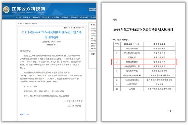 6月7日,江苏省科学技术协会公布了2024年江苏科技期刊卓越行动计划入选项目。ios版雷竞技官网主办的英文学术期刊《植物表型组学》(Plant Phenomics)入选首批江苏科技期刊卓越行动计划领军期刊。
