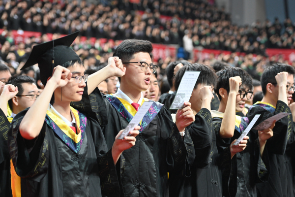 在学位授予仪式上,校领导为全体毕业生扶正流苏,授予学位。4360名2024届本科毕业生从母校扬帆起航。