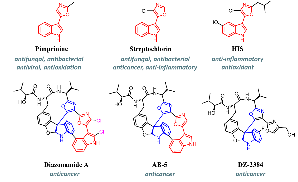 5-(3’-吲哚基)噁唑结构是一种独特的杂环骨架,存在于许多海洋天然产物和潜在的药物先导结构中。含有这种骨架的化合物,无论是天然源分离获取的,还是人工合成的衍生物,都表现出广泛的生物活性,例如Pimprinine (皮普利宁)和Streptochlorin (氯链素)两种天然产物都具有抗真菌和抗细菌活性,除此之外,皮普利宁表现出抗病毒和抗氧化活性,氯链素具有抗癌和抗炎活性。文章对含有5-(3’-吲哚基)噁唑结构的化合物包括抗癌、抗菌、抗病毒、抗氧化和抗炎等在内的众多生物活性进行了详细总结,涵盖团队前期研究发现5-(3’-吲哚基)噁唑类化合物表现出优异的农用生物活性,包括抗植物病原真菌、除草和杀虫活性等。