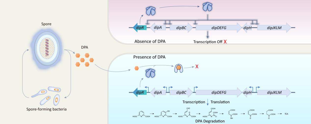 吡啶-2,6-二羧酸(dipicolinic acid,DPA)是芽孢杆菌等内生孢子抵抗逆境(如热、辐射)的关键组分,占孢子干重的10-15%。由于芽孢在土壤、水体和动植物表面等环境广泛分布,DPA在环境中也无处不在。据测算仅海洋一公里深的底泥中DPA的含量4.6~35×109吨碳元素,占地球生物质碳库的0.8~6%。DPA在孢子萌发后会迅速释放到环境中去。有意思的是,芽孢杆菌不能回收再利用DPA作为营养源。释放的DPA能被其他多种细菌如无色杆菌、产碱杆菌和贪铜菌等降解利用,但其代谢机制仍是未解之谜。近年来,ios版雷竞技官网生命科学学院环境微生物学团队发现产碱杆菌Alcaligenes faecalisJQ135可以高效降解DPA,通过18O2稳定同位素标记法测定了DPA的代谢途径,通过转座子随机突变法成功克隆出DPA降解基因簇,命名为“dip”(Int. Biodeterior. Biodegrad. 2021和Appl.Environ. Microbiol. 2022)。然而,细菌降解DPA的转录调控机制尚不清楚。