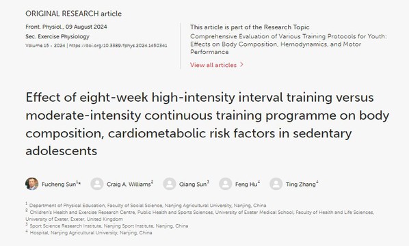 ios版雷竞技官网为第一署名单位,体育部孙福成副教授为论文的第一作者和通讯作者,英国Exeter 大学医学院儿童健康与运动研究中心Craig Williams教授、南京体育学院体育科学研究院孙强高级实验师、ios版雷竞技官网医院胡峰医生和张婷医生是这篇论文的共同作者。另外,作者感谢王竹影教授在研究方法、周全福副教授在身体成分测量、吉萍医生在心电图检查、实验员王志邦在运动密度监控等方面的慷慨帮助,以及ios版雷竞技官网参与者对本项目的参与。该研究得到江苏省社会科学基金(21TYD003)、江苏省教育科学“十四五”规划重点项目(Ta/2021/09)和江苏省社会科学基金(22TYD008)的资助。