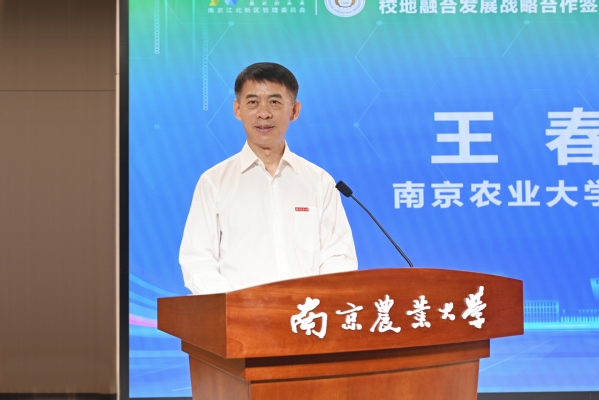 王春春对南京市和江北新区长期以来对我校事业发展给予的关心指导表示感谢。他指出,南农和江北新区的战略合作,是共同贯彻习近平总书记有关重要讲话和重要论述精神,共同面对新时代新发展的深度回应,是切实把合作系统化、实效化的战略选择。要聚焦人才培养,合力培育一种“新模式”,共同培养更多的知农爱农新型人才,引导更多青年人才来到新区、融入新区、扎根新区。要聚焦科技创新,合力打造一个“新引擎”,以大平台大团队孕育大成果,助力江北新区在江苏发展新质生产力的火热实践中勇当排头兵。要聚焦校地融合,合力探索一条“新路径”,有力推动滨江校区二期工程和教师公寓建设,让江北新区发展成果惠及南农师生;培育一批校地合作标杆,让南农建设成效辐射江北新区。