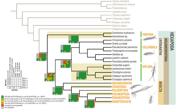 六足总纲(广义的昆虫)是动物界中生物多样性最高的类群。六足总纲目前分为4个纲,其中弹尾纲、原尾纲、双尾纲由于在形态特征上具有一些比较原始的特征,因此又被俗称是低等六足动物(或noninsect hexapods)。三类低等六足动物迄今为止已知大约10,800种,占动物多样性的1%左右。先前基于形态学和分子数据的系统发育分析未能就这三类低等六足动物和昆虫纲的进化关系达成一致,并且已经争论了一个多世纪。不同的进化关系也暗示了昆虫体型(body plan)和登陆(terrestrialization)的不同演化场景。