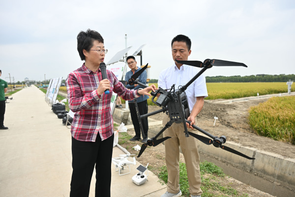副校长朱艳向全体参训教师介绍了智慧稻作技术盐都示范基地整体情况,详细讲解了数字稻田、稻情遥感监测、种肥水药智能决策、耕种管收精确作业、智慧稻作管理平台等智慧稻作核心技术,带领教师实地观摩了作物生长特征高光谱成像传感器、农情智能监测站、稻麦智能测产收割机、作物信息巡检机器人等智慧稻作技术产品与装备。