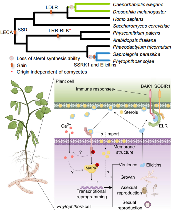 疫霉菌寄主范围广、破坏性强、危害大控制难,是一类重要的植物病原菌。疫霉菌基因组可塑性强,其致病分子演变速度快,常用的杀菌剂和抗性品种易被克服,迫切需要高效控制新策略。疫霉菌为甾醇异养生物,自身不能合成甾醇,从寄主获取甾醇是其致病重要环节。病原菌甾醇合成途径是药物研发的重要靶标之一,对于甾醇异养型病原菌,这类药物无效。但是甾醇异养型病原菌需要完成其生活史,势必进化出强大的寄主甾醇感知与利用途径,破解其中机制将是针对性研发疫霉菌高效杀菌剂的重要途径之一。