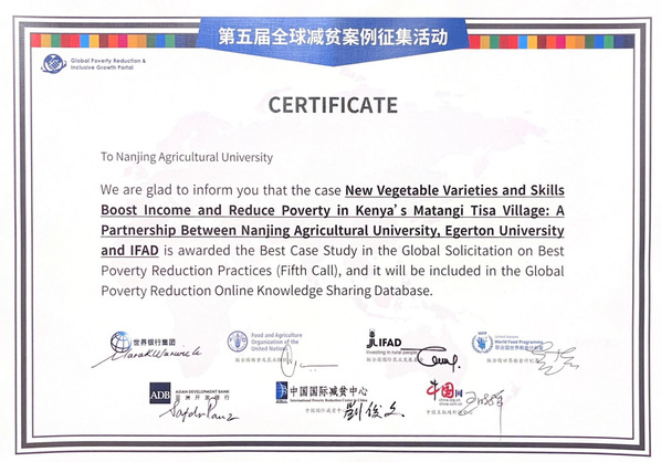 马坦吉提萨村位于肯尼亚纳库鲁郡巴哈提社区。接受减贫帮扶前,当地农民经常由于气候灾害等原因遭遇农业减产甚至绝收,生活极度贫困。2022年10月,南农在该村挂牌成立全球首个中非农业发展与减贫示范村,推行“国际组织支持、当地政府参与、中肯高校合作”的“三位一体”减贫模式,将中国-肯尼亚作物分子生物学“一带一路”联合实验室培育的作物新品种、中国先进的农业技术在该村示范推广。结果显示,试种的粮用菜豆新品种“切啦垄”在干旱条件下每公顷产量为2.5吨,是当地目前粮用菜豆产量的1.6倍;引进推广的番茄嫁接技术将青枯病发病率从90%降低到10%以下,产量由近乎绝收提高到亩产5,000-6,000公斤,每亩收入可增加近10万肯先令(折合人民币约5000多元)。新品种、新技术辐射了周围约200家农户,“三位一体”、多方协作助力当地农民减贫增收。