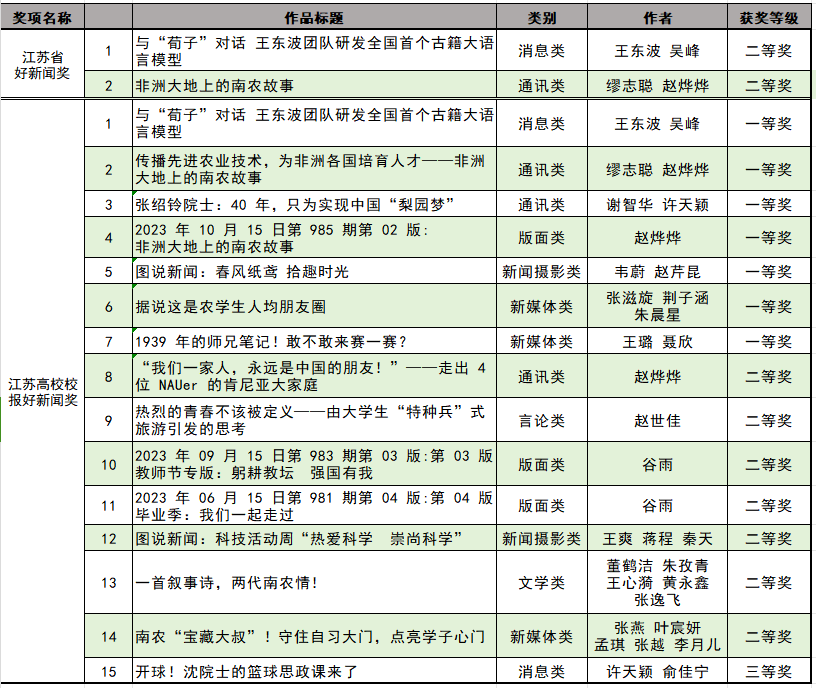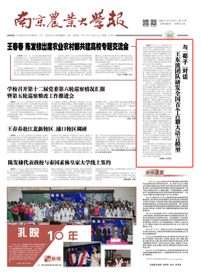 “江苏省好新闻奖”是江苏省新闻界的最高奖项,每年评选一次,旨在表彰在新闻采编、传播等方面表现突出的作品。该奖项由江苏省新闻工作者协会组织评选,涵盖了文字作品、媒体融合、网络作品、报纸副刊等多个类别。在2023年度江苏好新闻奖评选中,我校两件校报作品《非洲大地上的南农故事》《与“荀子”对话王东波团队研发全国首个古籍大语言模型》由江苏高校融媒体研究会选送,代表江苏全省高校参评,创造ios版雷竞技官网新闻宣传工作在该评比中数量和质量的最好成绩。