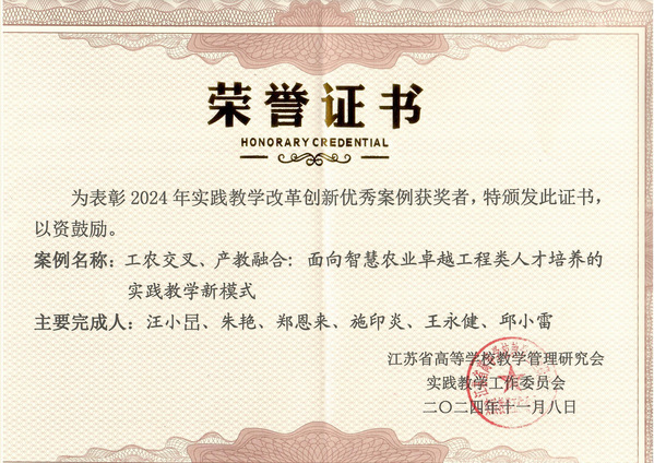 为展示全省高校在实践教学改革创新中的探索成果,推动实践教学高质量发展,实践教学工作委员会今年首次开展了“实践教学改革创新优秀案例”征集活动。我校汪小旵、朱艳等撰写的《工农交叉、产教融合: 面向智慧农业卓越工程类人才培养的实践教学新模式》,获2024年实践教学改革创新优秀案例(全省共20项)。