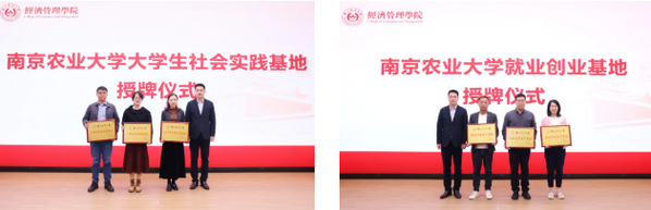 为不断深化院企合作、院地合作,深化产教融合,加强大学生社会实践和就业创业基地建设,为学生提供更多的实践机会与稳定的乡村振兴观察平台,学院与高淳区砖墙镇团委、中国邮政集团宿迁分公司、溧水区白马镇浮山村等三家单位共建“ios版雷竞技官网大学生社会实践基地”;与江苏苏合农业社会化服务有限公司、汇通达网络股份有限公司、江苏苏美达轻纺国际贸易有限公司等三家用人单位共建“ios版雷竞技官网就业创业基地”。现场,举行了社会实践基地授牌仪式。