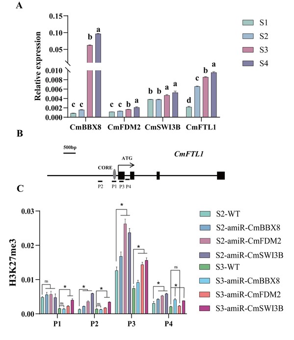 通过RT-qPCR发现,CmBBX8、CmFDM2、CmSWI3B和CmFTL1表达水平在菊花光周期连续诱导生长发育的4个阶段:S1(5叶)、S2(10叶)、S3(16叶)和S4(22叶,有肉眼可见小蕾),分别呈现持续增加的趋势(图2A)。另外,将CmFTL1染色质分为4个区段,通过ChIP-qPCR发现,在CmBBX8、CmFDM2、CmSWI3B干扰株系中,H3K27me3富集水平比野生型显著增加,而且从S2(营养生长期)向S3(生殖生长期)时期转变的过程中,H3K27me3富集水平显著降低(图2B,C)。综上,CmBBX8通过招募CmFDM2/CmSWI3B来降低CmFTL1染色质上H3K27me3的富集水平,从而促进菊花开花,完成成花转变。