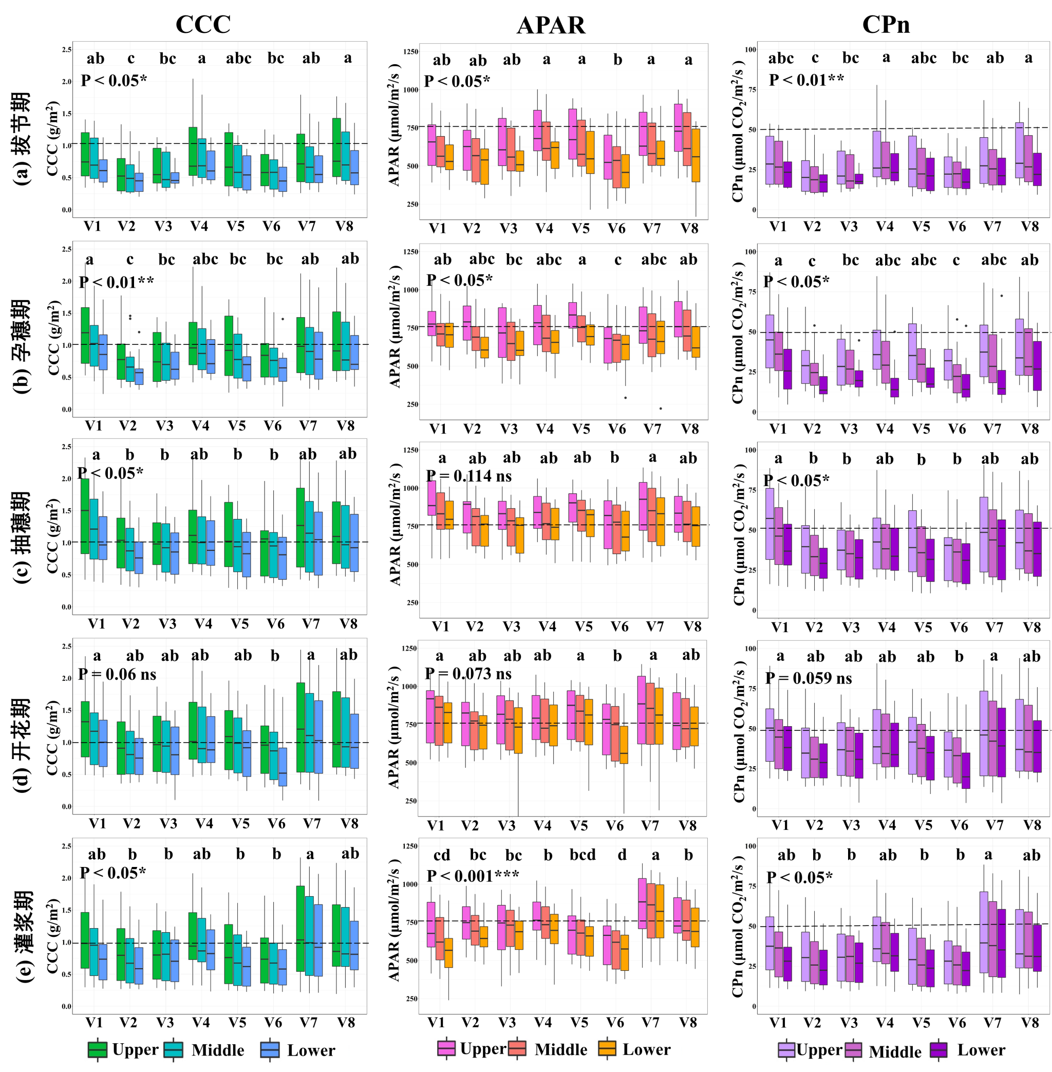 基于数字表面模型方法,将无人机平台的LiDAR点云与多光谱影像反射率进行融合,量化了小麦的三维光合性状。结果表明,融合光谱信息后的点云能够准确表征不同条件下的小麦光合参数三维空间分布(图1)。小麦冠层不同层(上层、中层和下层)之间的光合性状具有显著差异性(p< 0.05)(图2)。