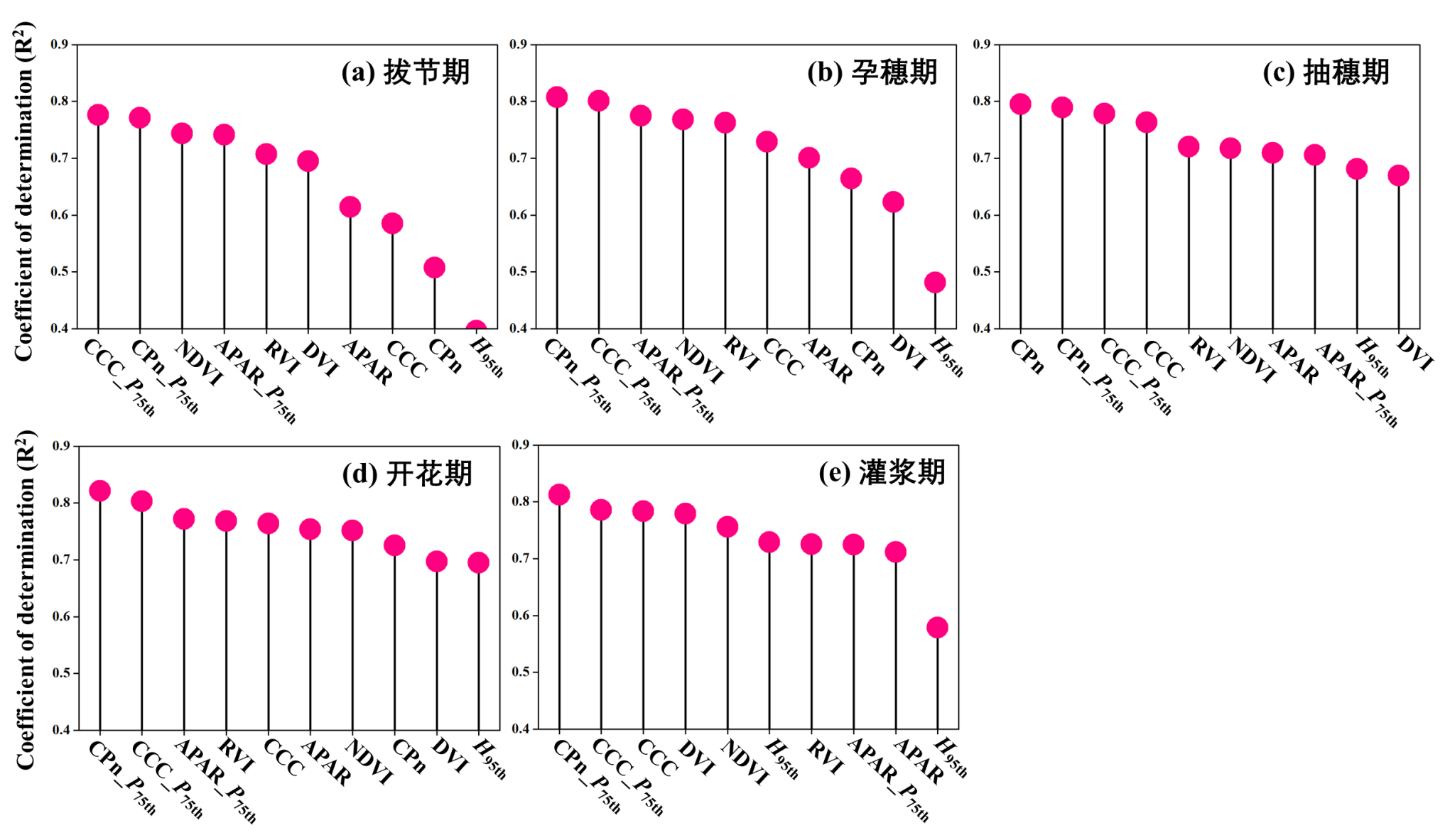 图3 各参数在不同生育期对产量的估测能力