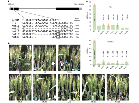 图2 MY背景Fhb1近等基因系R-7中的PFT 编辑及其对赤霉病抗性的影响