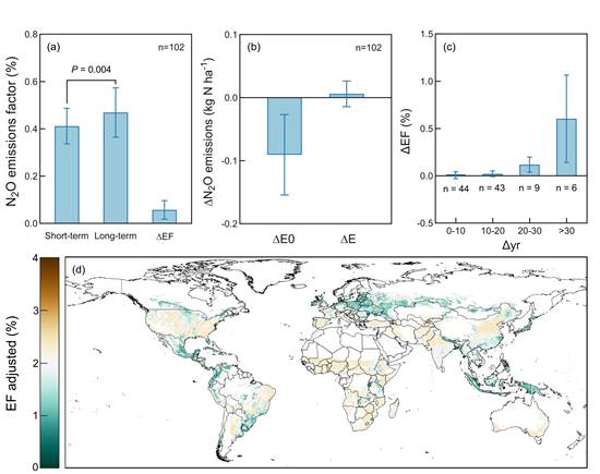 研究团队整合全球多站点田间试验数据,结合涵盖三大主粮作物(水稻、小麦、玉米)的三个长期定位田间试验结果发现,随着施肥年限增加,N₂O排放因子呈现显著上升趋势。其机制是长期氮肥施用会持续提升土壤氮素有效性、降低pH值,并显著富集含nirS基因的产N₂O微生物。基于此,团队通过数据整合与空间建模分析,将氮肥遗留效应纳入现有评估模型,结果显示,考虑长期氮肥遗留效应后,全球农田N₂O排放因子为1.9%,N₂O年排放量达2.1 Tg N₂O-N,较IPCC的预测值高出110%。相关研究成果增强了对农田N₂O排放的科学认识,并可为农田温室气体排放清单的精准编制及区域针对性丰产减排方案的制定提供理论依据。